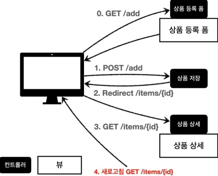 위의 문제를 해결하기 위해서는 상품등록 폼에서 POST /add로 상품을 등록 한 후 뷰 템플릿으로 이동하는 것이 아니라 상품 상세화면으로 리다이렉트를 호출해 주면 된다. 이후 새로고침을 하면 마지막에 호출한 내용인 GET /items/{id}가 호출되어 위의 문제를 해결할 수 있다.