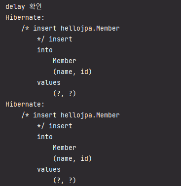 memberA와 memberB가 persist()할 때 쿼리가 날아가지 않고 트랜잭션이 commit() 될 때 flush가 되면서 insert query 2개 날아가는 것을 볼 수 있다.