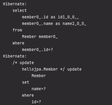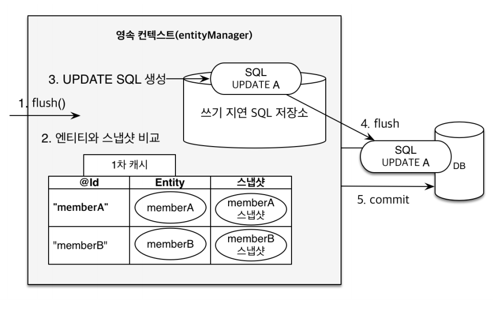 update를 하는 코드가 없어도 flush()후 엔티티와 스냅샷을 비교하여 변경된 부분이 있을 시 UPDATE SQL이 생성되어 DB에 flush 된다.