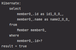 member1을 데이터베이스에서 조회하여 1차캐시에 캐싱하기 때문에 member1과 기본키를 가지는 member2를 조회할 때는 쿼리가 날아가지 않고 1차 캐시 안에서 조회해 오기 때문에 member1과 member2는 동일한 엔티티임을 확인할 수 있다.