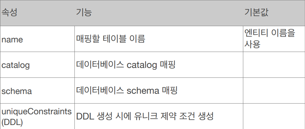 속성 name은 JPA에서 사용할 Entity이름을 지정할 수 있다.(기본값: 클래스 이름)