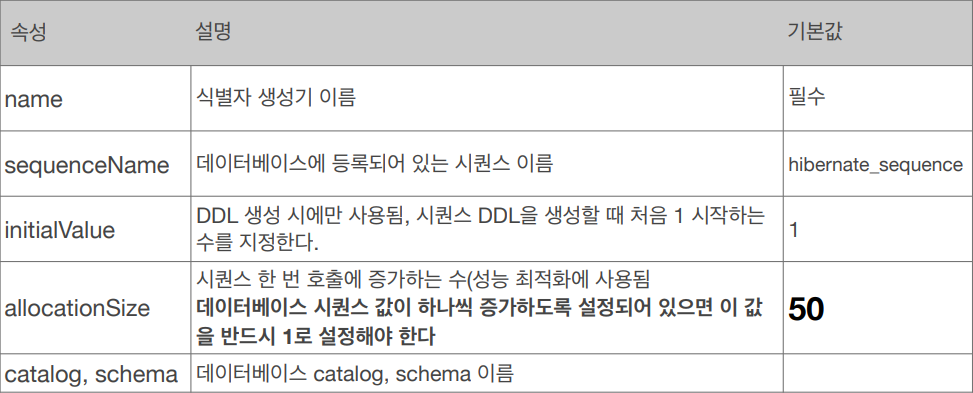 allocationSize를 만약 50으로 설정 할 경우 DB에는 sequence를 50으로 올려두고 메모리상에서는 1씩 증가하여 sequence를 불러오는 데이터베이스와의 통신을 줄여서 성능을 최적화할 수 있다. 50개를 다 쓸 경우 데이터베이스와의 통신을 통해 size만큼 DB의 sequence를 올려준다. 하지만 size를 너무 크게 할 경우 웹 서버가 꺼지면 중간에 빈 값이 발생할 수 있으므로 적절한 size를 선택하여야 한다.