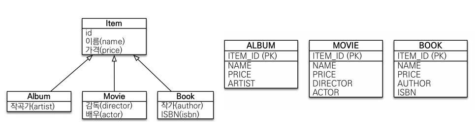 (3) 서브타입 테이블로 변환 ->구현 클래스마다 테이블 전략