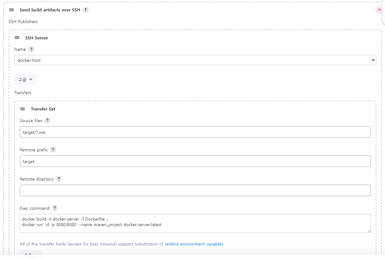 빌드 유발에서 Poll SCM 설정을 꺼주고 빌드후 조치에서 Deplay war/ear to a container를 삭제 하고 빌드후 조치 Send build artifacts over SSH 추가하고 빌드합니다.