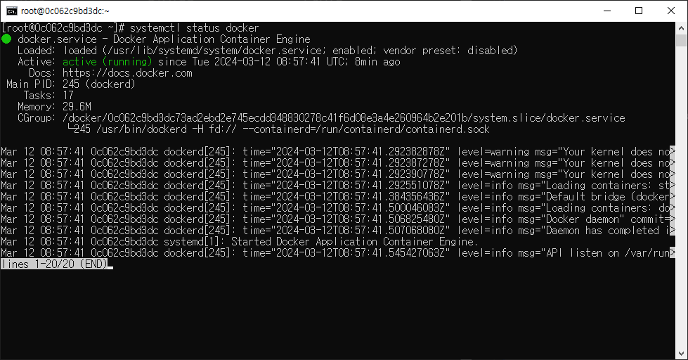 systemctl enable docker:시스템 부팅시 자동으로 docker가 기동되도록 설정