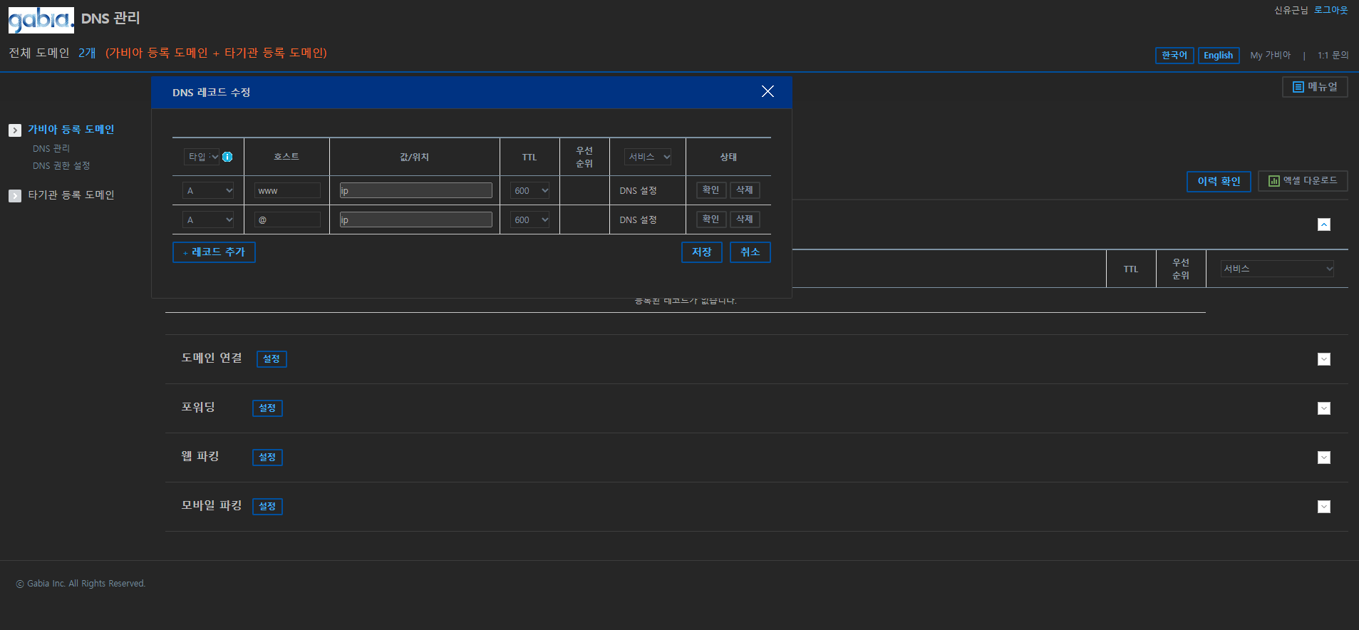 레코드 설정을 누른 후 타입에 A 호스트에 www,@을 입력하고 값/위치에 public ip를 입력하고 저장합니다.