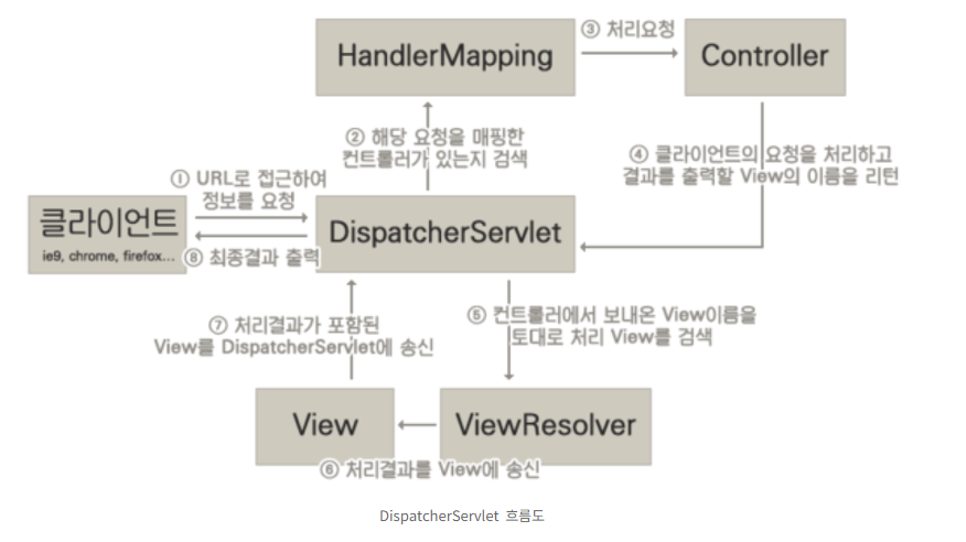 Spring MVC 패턴에서 기본적으로 사용하는 Servlet으로, 클라이언트의 요청이 있을 시 가장 앞단에서 요청을 가로채어 요청에 매핑되는 Controller에 작업을 전달하고 비즈니스 로직 처리 후 해당 결과 View를 클라이언트에 전달하는 역할