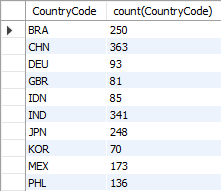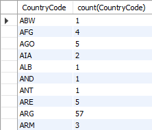 select CountryCode,count(CountryCode) from city group by CountryCode;